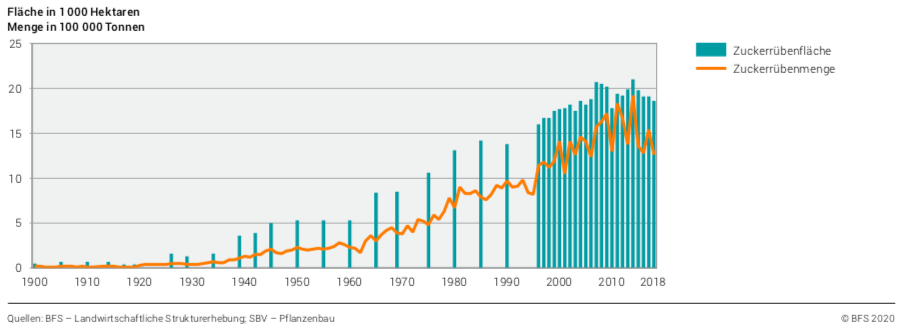 Das Bundesamt für Statistik BFS hat ein 4-seitiges PDF-Dokument im Open Data-Portal veröffentlicht, das sind rund um das Thema Zucker beschäftigt. So wurden Zuckerrüben im Jahr 2018 auf einer Fläche von 18.600 Hektar angebaut. Aus 1,3 Millionen Tonnen Zuckerrüben wurden 194.000 Tonnen Zucker herstellt. Das entspricht einem Selbstversorgungsgrad von 72 % des inländisch verbrauchten Zuckers.