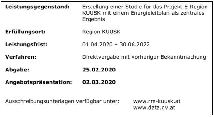 Der Eintrag im Metadatenportal data.gv.at verlinkt auf einen Blogpost für die Region Kufstein und Umgebung, Untere Schranne - Kaiserwinkl. Dort kann man sich die Angebotsunterlagen zur Erarbeitung einer Studie aus einer öffentlichen Dropbox herunterladen. Die Veröffentlichung im Datenportal dient der offiziellen Bekanntmachung des Verfahrens.